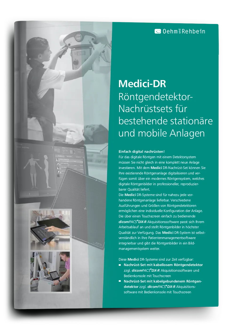 Mit dem Medici DR-Nachrüst-Set digitalisieren Sie Ihre bestehende Röntgenanlage ganz ohne Neuanschaffung. Die Lösung ist für stationäre und mobile Systeme verfügbar. Hochwertige Detektoren in verschiedenen Größen ermöglichen eine individuelle Konfiguration für nahezu jedes System. Die intuitive dicomPACS®DX-R Software liefert digitale Röntgenbilder in professioneller, reproduzierbarer Qualität und integriert sich nahtlos in Ihre Praxis- und Bildmanagementsysteme.