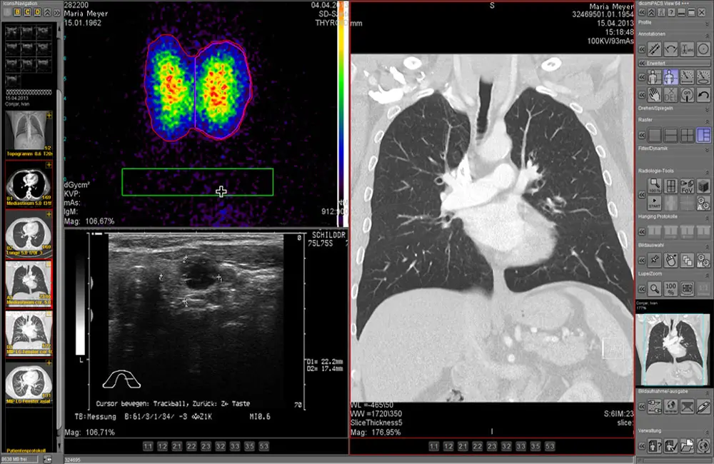 A wide range of tools such as window technology, surgical documentation, MPR/MIP functions. Integration of dictation and speech recognition as well as optional AI-supported chest screening.