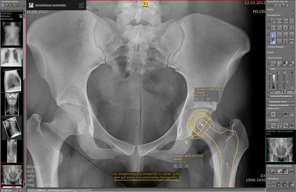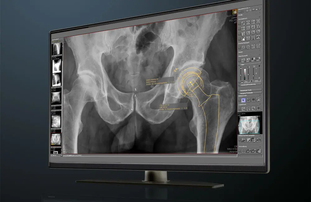 The prosthesis documentation module enables preoperative planning and documentation. Digital templates can be superimposed on the X-ray image or foil prosthesis templates can be used.