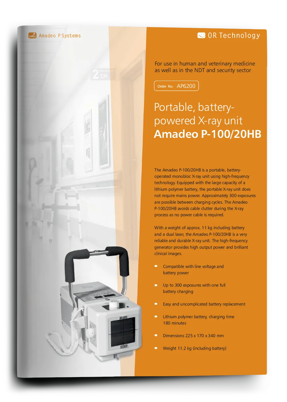 An Amadeo P X-ray machine in combination with the Leonardo DR nano is the ideal solution for mobile X-ray imaging. The Leonardo DR nano consists solely of a wireless X-ray detector and a tablet PC/notebook. Weighing only approx. 8 kg (including bag, notebook, accessories and detector), it is one of the lightest portable X-ray solutions in the world.