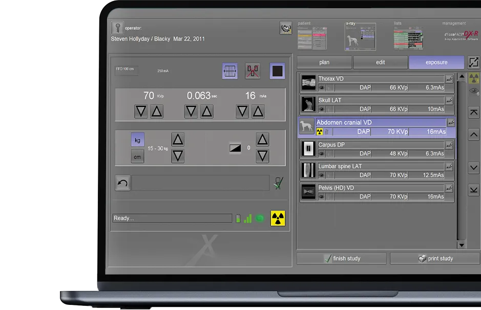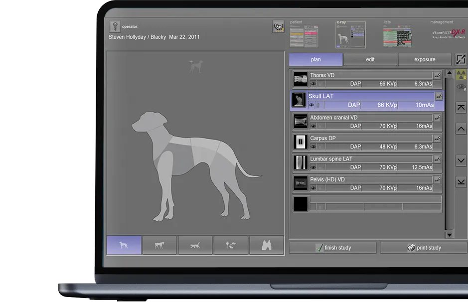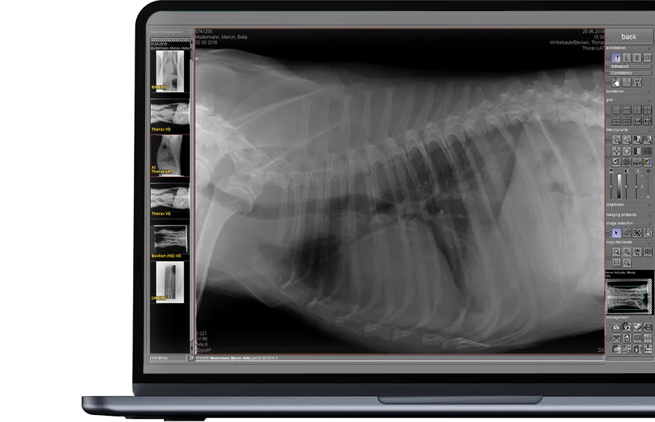 dicomPACS®DX-R is the heart of our OR 4Vet systems – featuring smart operation, AI support, dynamic X-ray, and wireless control – perfectly tailored to modern veterinary medicine. A fast and reliable acquisition and diagnostic software that optimally supports you in everyday practice.